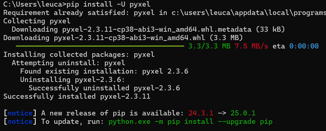 Successfully installed pyxel-X.X.Xと表示されれば成功です。