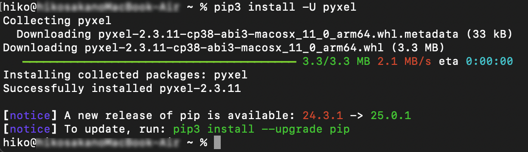 Mac OSの場合は、「pip3 install -U pyxel」というコマンドを実行してください。Successfully installed pyxel-X.X.Xと表示されれば成功です。