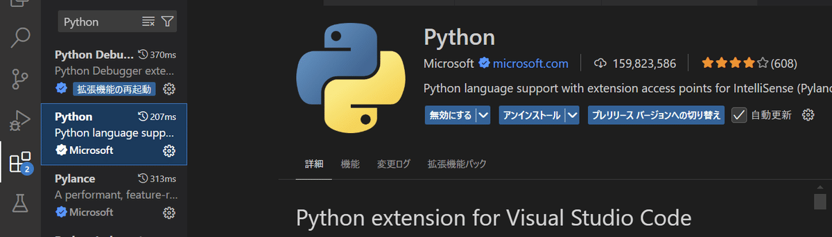 ↓拡張機能(Extensions)の検索窓に「Python」と入力し、一番上に表示される「Python」をインストールします。