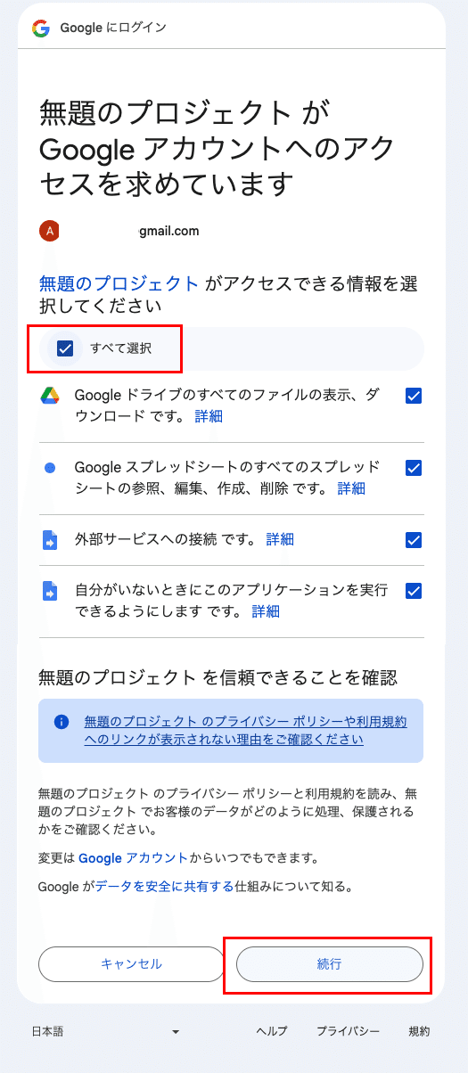 自分のGoogleアカウントを選択し、「詳細」>「(安全でないページ)に移動」をクリックして、表示される権限(Googleスプレッドシート、Google Drive、外部サービスへの接続)を「許可」します。