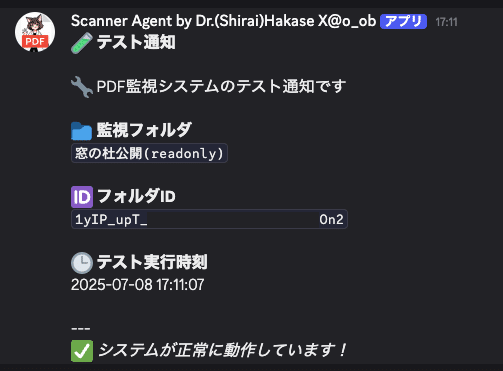 これで、ScanSnapで新しいPDFが保存されるたびに、自動的にスプレッドシートに記録され、Discordに通知されます!