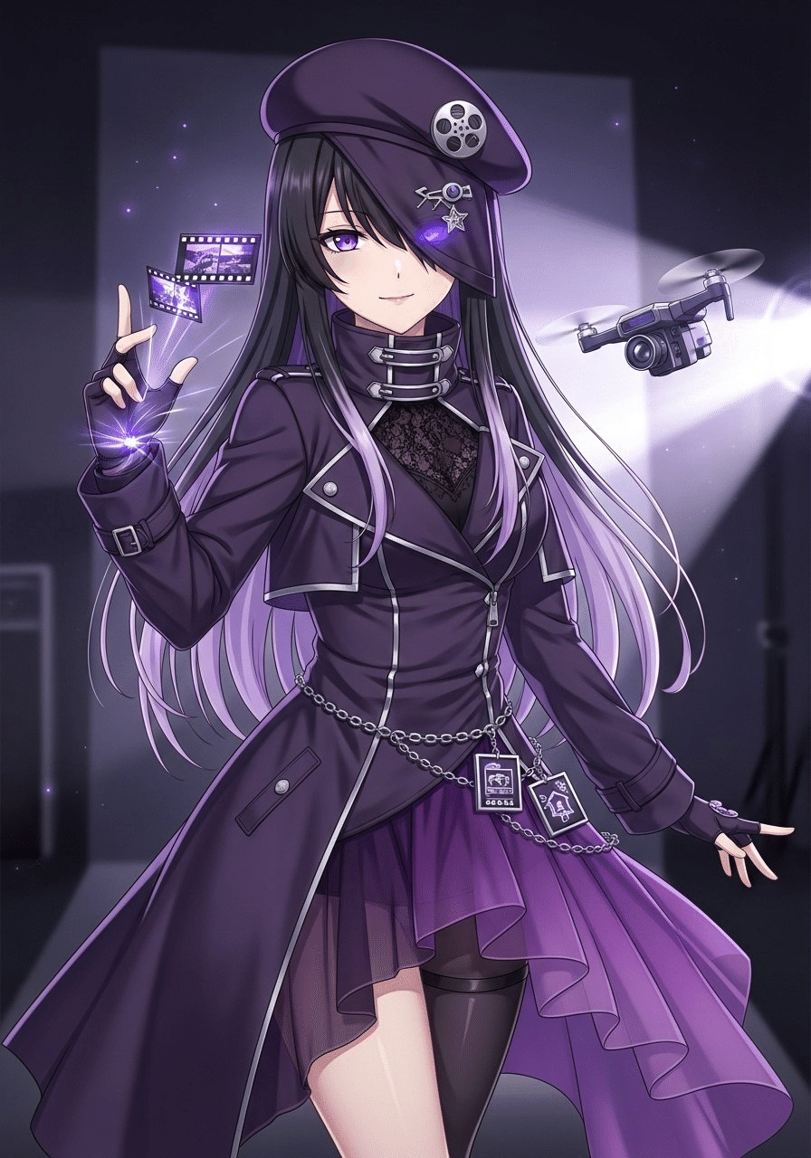 ミステリアスなキャラクター設定を追加いただきました。片目を隠している軍服風の衣装の他、ドローンやフィルムといった動画要素があしらわれており、動画担当としての個性付けがされていて素敵です!