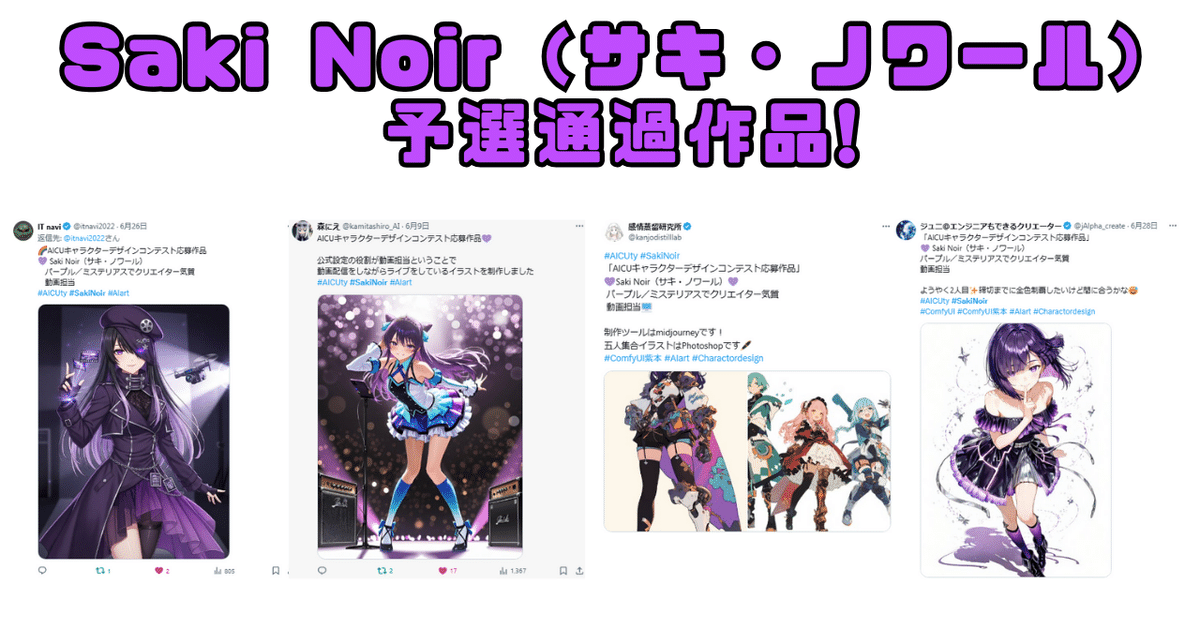 つくる人をつくる!AICU主催 人とAIがつくるアイドル「Project AiCuty」キャラデザコンテストにご応募いただきありがとうございました!アートディレクション部門をあわせて46作品を超える多数の応募をいただきました。アイキューティのメンバー、Mei Soleil(メイ・ソレイユ)、Nao Verde(ナオ・ヴェルデ)、Mina Azure(ミナ・アズール)、 Elena Bloom(エレナ・ブルーム)…と各メンバーの予選通過作品を紹介してきましたが、本日は最後!Saki Noir(サキ・ノワール)応募作品を紹介します。