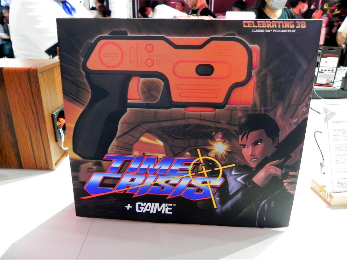 今回のTGS2024で展示されていたデモは、1995年にナムコ(現バンダイナムコ)がゲームセンター用に開発したガンシューティングゲームの「タイムクライシス」のライセンス版が遊べる本体とガンコンとペダルという構成で、本体をディスプレイに接続するだけでの手間いらずで直ぐにプレイすることができます。