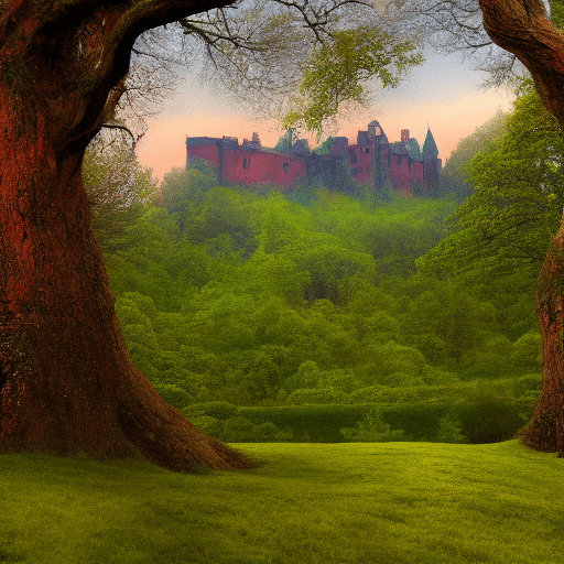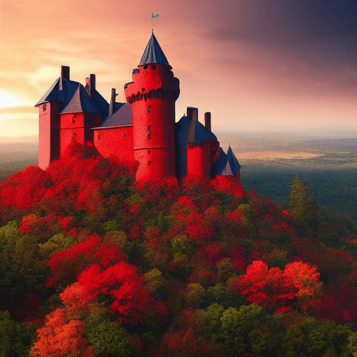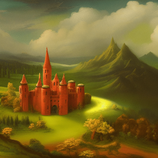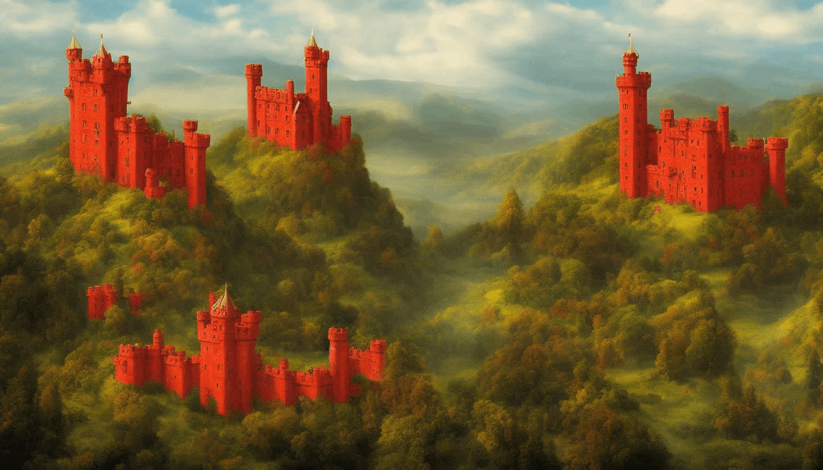「広大な緑の森 を見下ろす丘の上の赤い城 」という「緑の森」と「赤い城」が混在するプロンプトです。