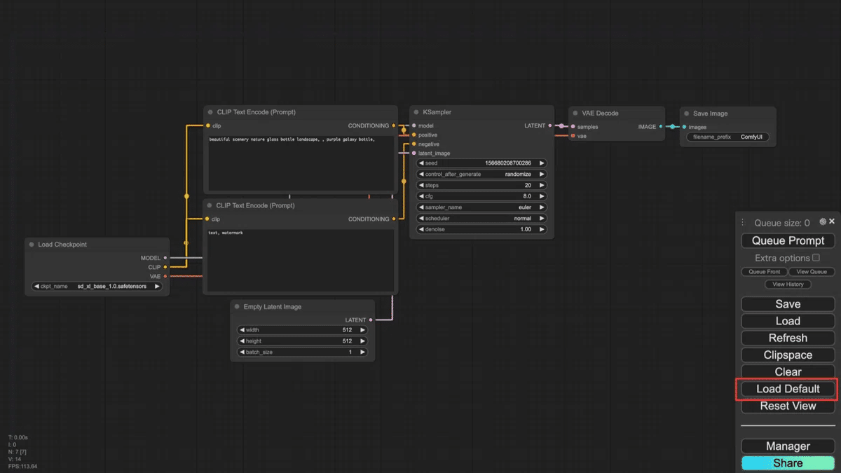 • メニューの 「Load Default」 をクリックし、標準のワークフローをロードした状態にします。前回の続きで改造しても構いません。