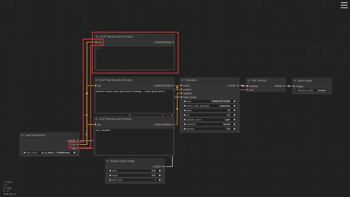 • 1つ目のCLIPTextEncode ノードのプロンプトに「a red castle on a hill 」と入力します。これをCLIP1 と呼ぶことにします。