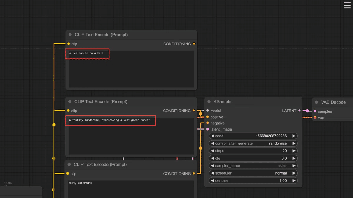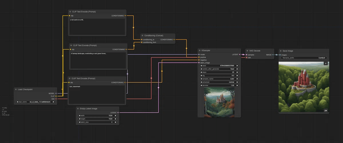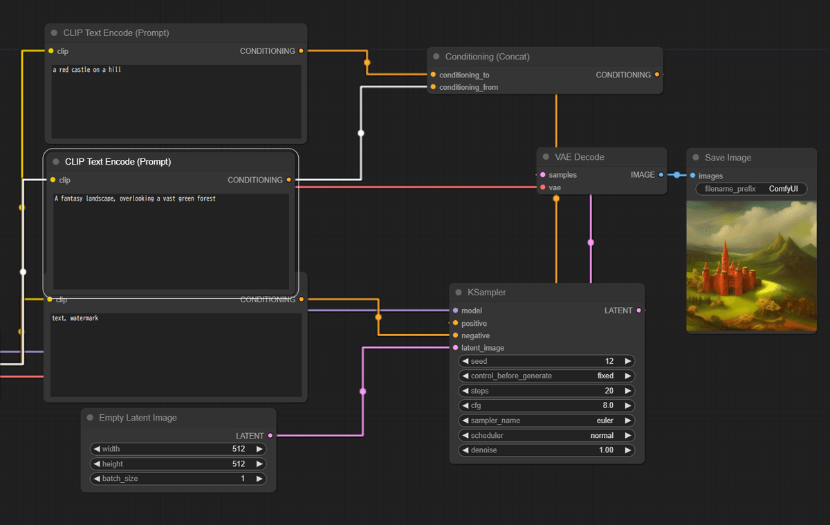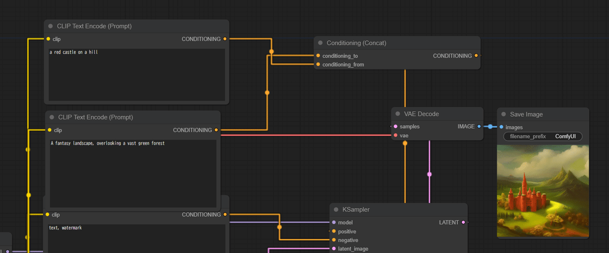 これでCLIP1が「丘の上の赤い城」、CLIP2が「広大な緑の森を見下ろす幻想的な風景」となり、それぞれがConcatを通して条件づけされることになります。どんな画像が生成されるのでしょうか。