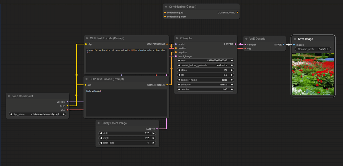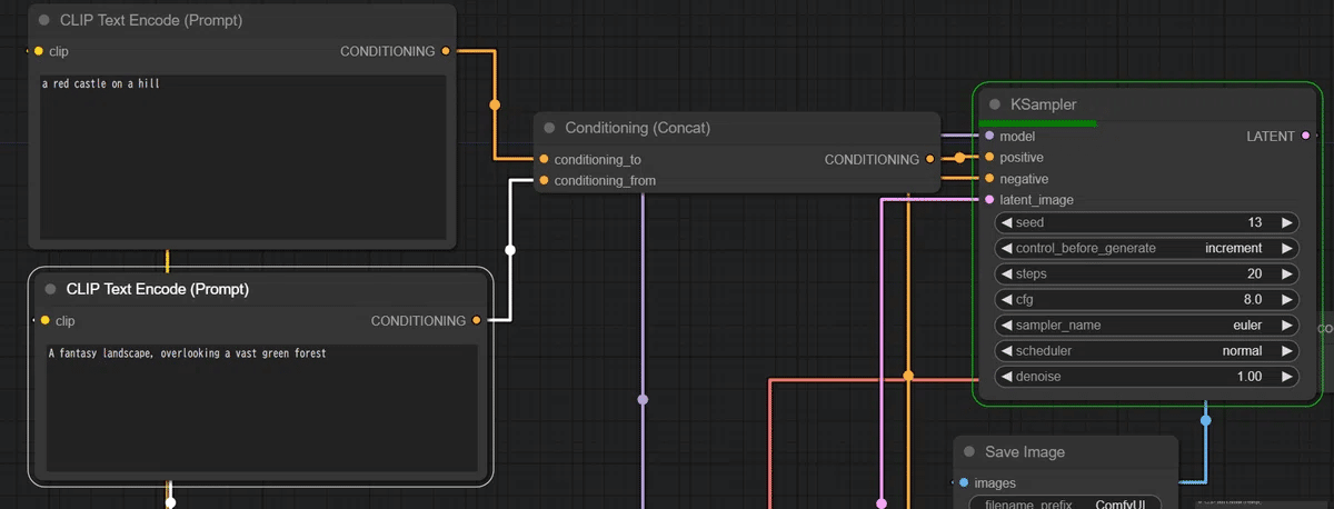 • Conditioning (Concat) ノードの出力をKSamplerpositive 入力に接続します。