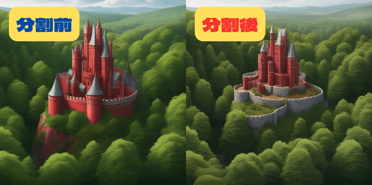以下の画像は、分割前と分割後の比較画像になります。分割前は、森は緑ですが、丘が赤くなっています。分割後は、城だけが赤くなっていることが確認できます。
