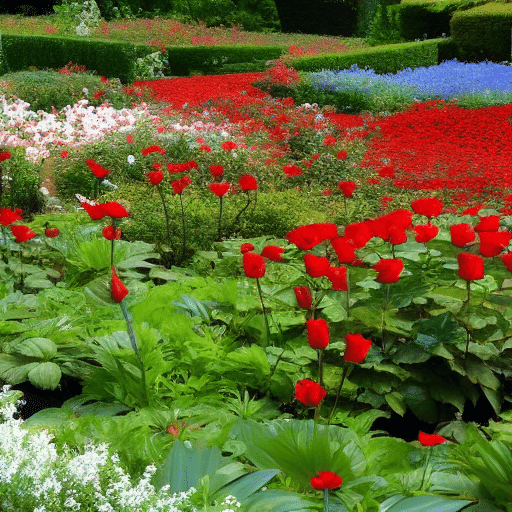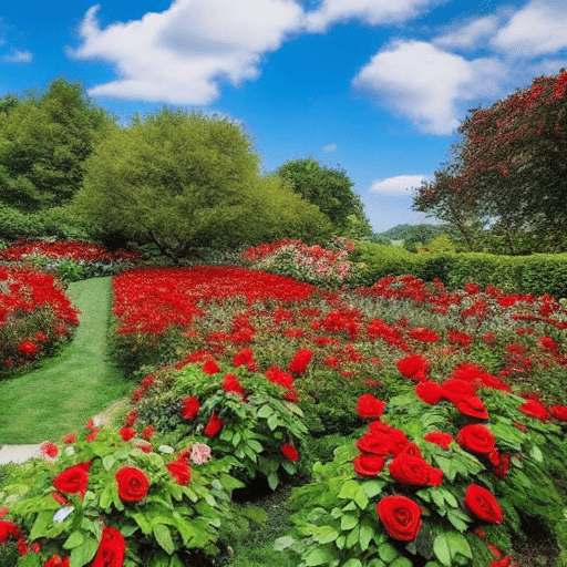 "A beautiful garden with red roses and white lilies blooming under a clear blue sky"