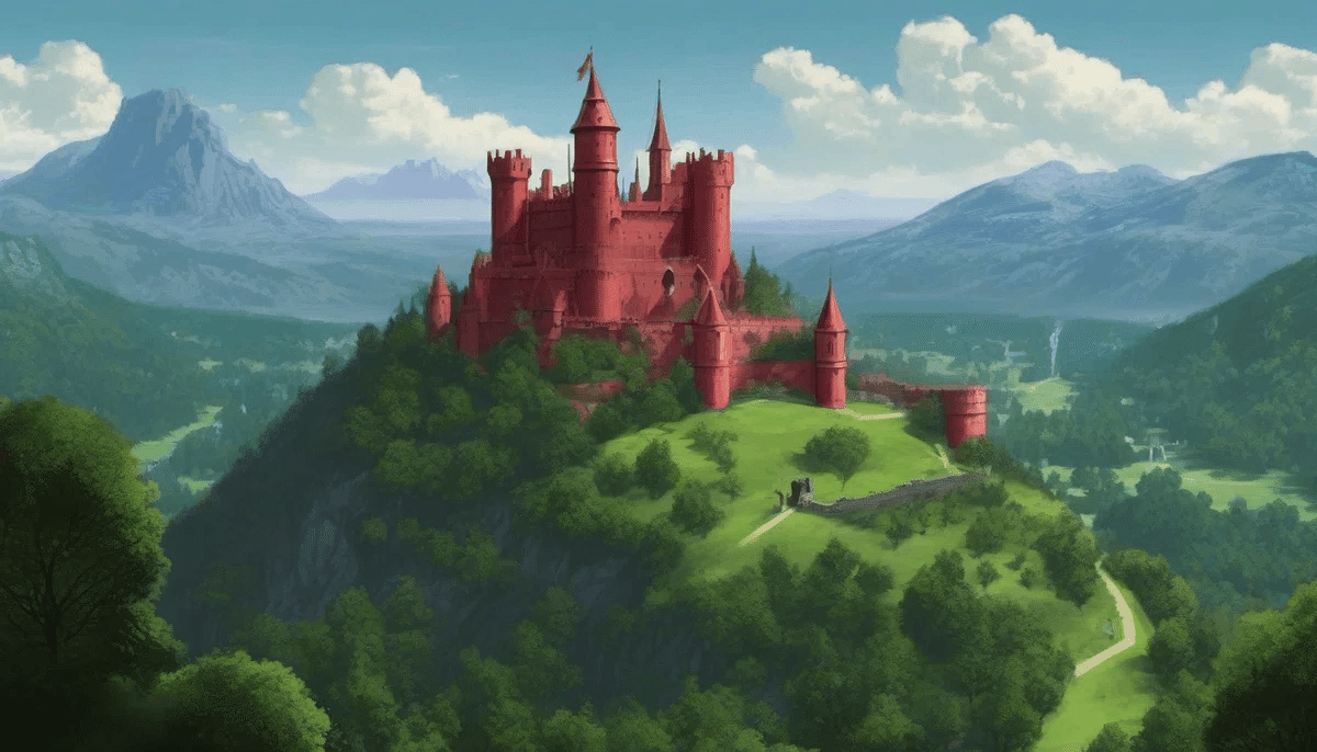 A fantasy landscape, a red castle on a hill, overlooking a vast green forest,