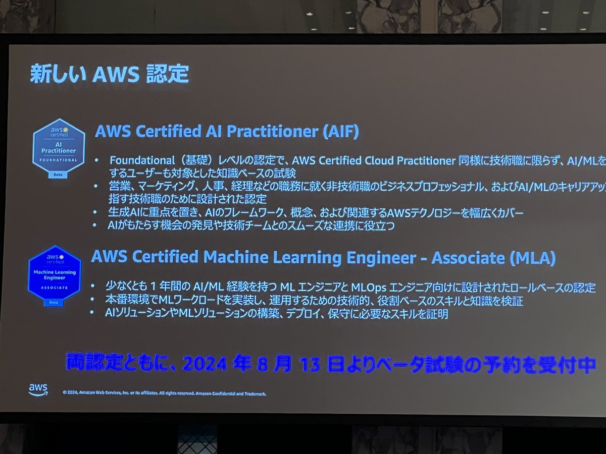 最後に新しいAWS認定試験「AWS Certified AI Practitioner (AIF)」や「AWS Certified Machine Leaning Engineer - Associate (MLA)」についての紹介や、お楽しみ、商品つきクイズ大会も!