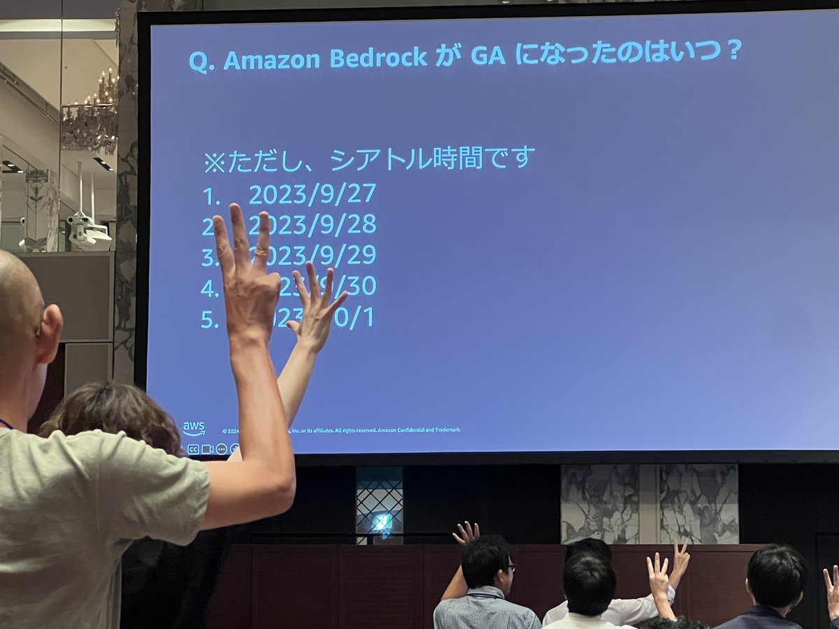 Loading tweet component... Loading tweet component... 難問中の難問。 実際にClaude 3.5 sonnetに訊いてみます。 300人を超える参加者が非常に快適で濃密な知識交換をできる機会となりました。 Loading tweet component... Loading tweet component... https://aws.amazon.com/jp/events/ai-day/ 生成AI時代に「つくる人をつくる」AICUとしては総力をあげて4回特集でお送りいたしました。 https://ja.aicu.ai/awsaiday20240909/ https://ja.aicu.ai/awsaiday20240910/ https://ja.aicu.ai/awsaiday20240911/ お楽しみいただけましたでしょうか。 この記事の続きはこちらから https://note.com/aicu/n/n4a38bcebe324 Originally published at https://note.com on Sept 12, 2024.