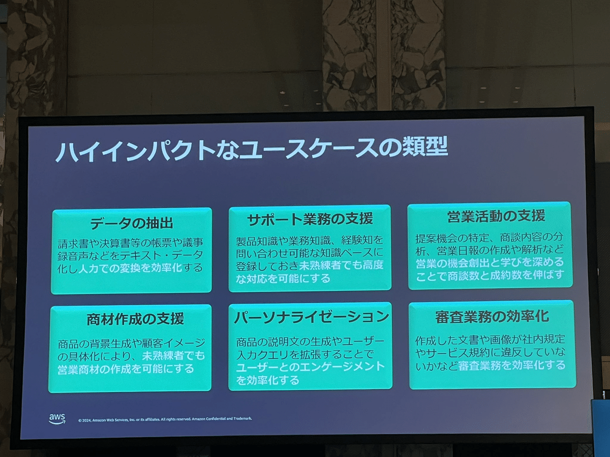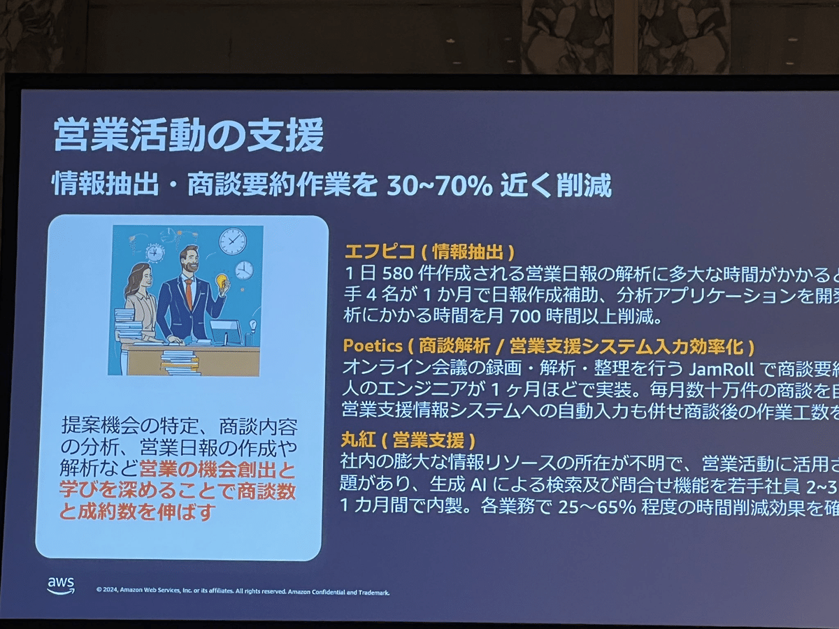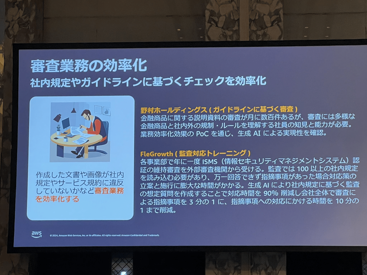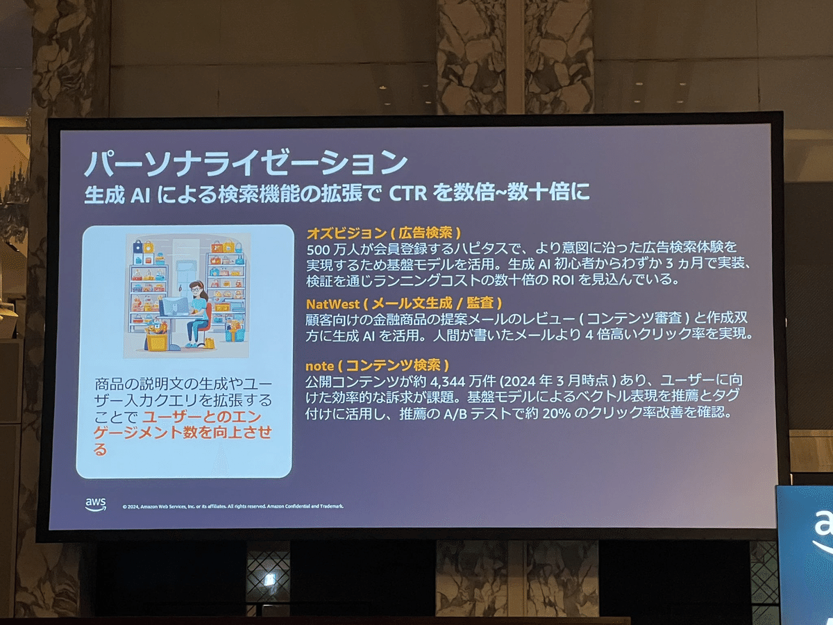 Loading tweet component... Loading tweet component... 飯田氏の講演では、まずユースケースを2つに分けました。 さらに様々な産業で共通する「一般的なユースケース」において さらに「業界特化の課題にフォーカスしたユースケース」において そして「ハイインパクトなユースケースの類型」 1社あたり3行程度の事例ですが、具体的な数字を入れつつすごい勢いでインパクトのある事例が紹介されていきます。 第一興商:入社1ヶ月の新人が3週間で9割は採用基準を満たす会話記録 AWS未経験で入社1ヶ月の新人が3週間でAmazon TranscribeとAmazon Bedrockを利用して検証。約9割は基準を満たす良好な結果。 パルシステム:マーケティングのための商材作成 北海道文化放送:FAXで届くリリース情報からニュース原稿の作成フローにAI活用 日本製鋼所: 営業応対に活用。開発期間2ヶ月 セゾンテクノロジー: HULFT製品のテクニカルサポートエンジニアが回答作成時間を最低30%短縮 パーソナライゼーションではNatWestの事例 営業活動の支援ではエフピコさんの事例で日報作成を紹介。 審査業務の効率化では野村ホールディングスの事例と、FleGrowthでの監査対応トレーニング事例が紹介されました。