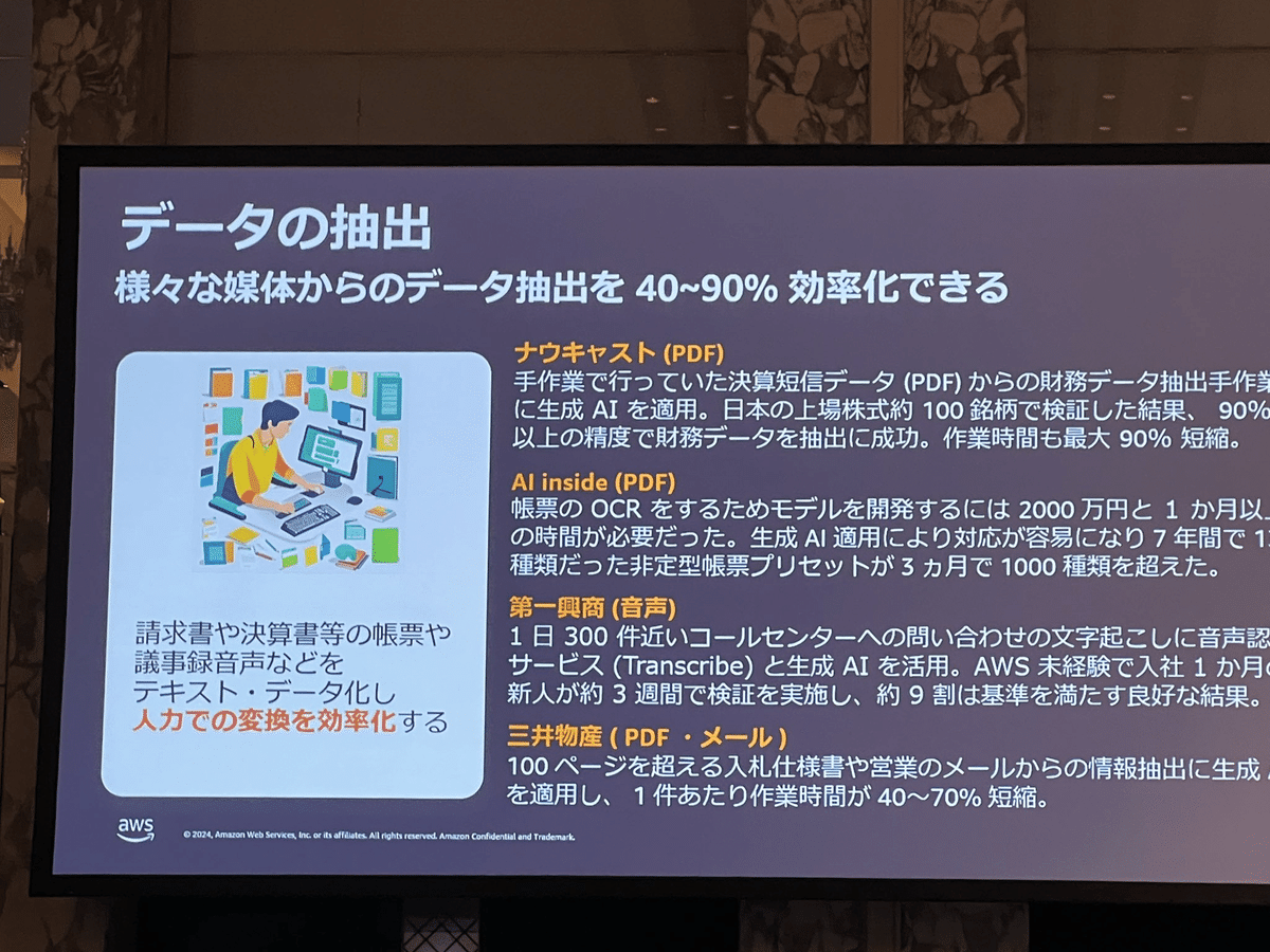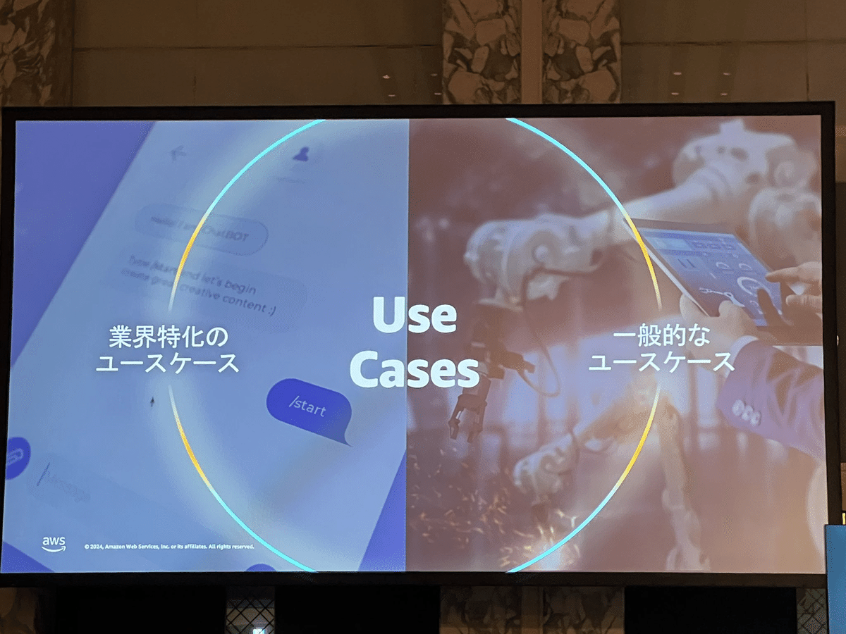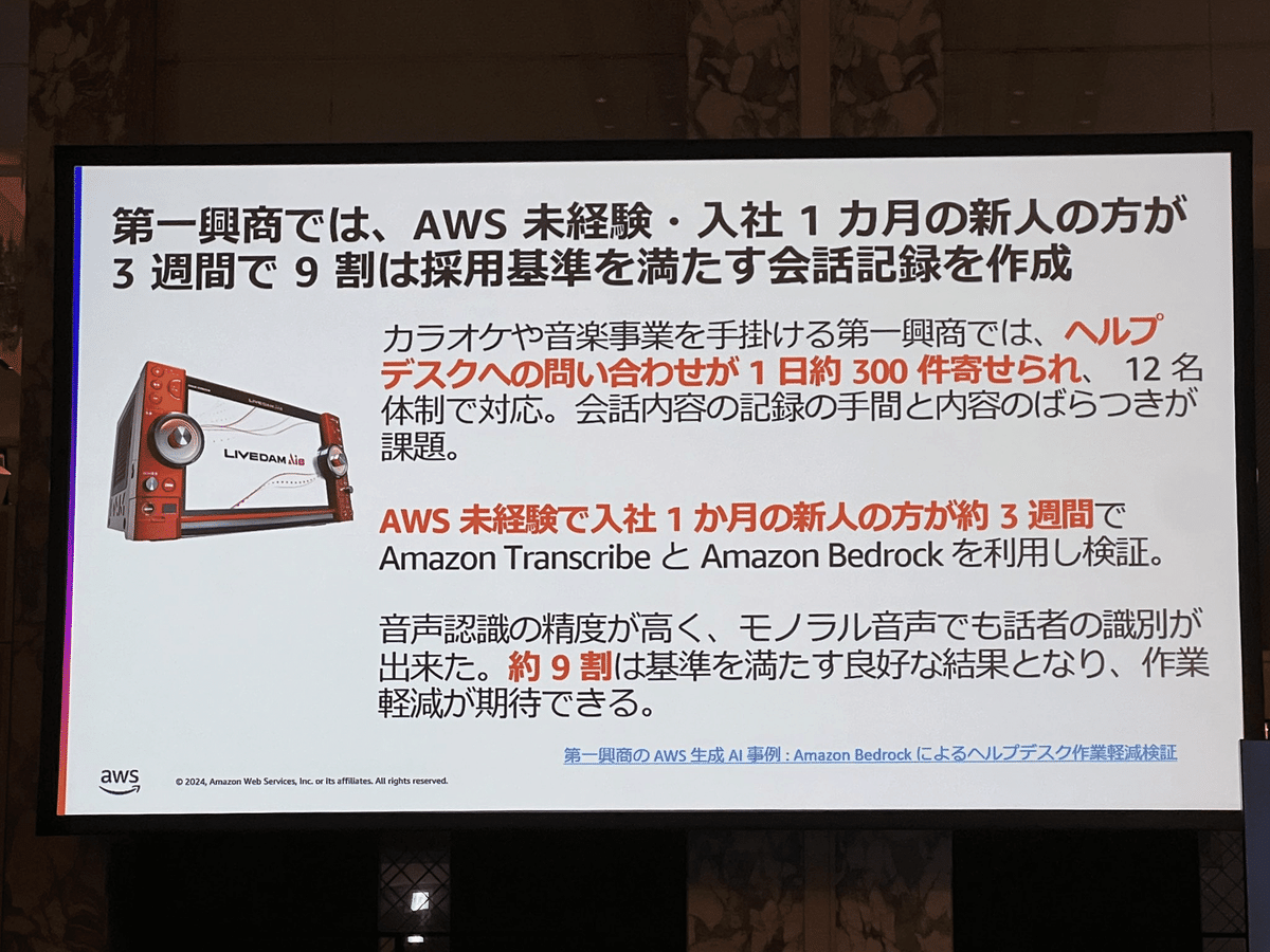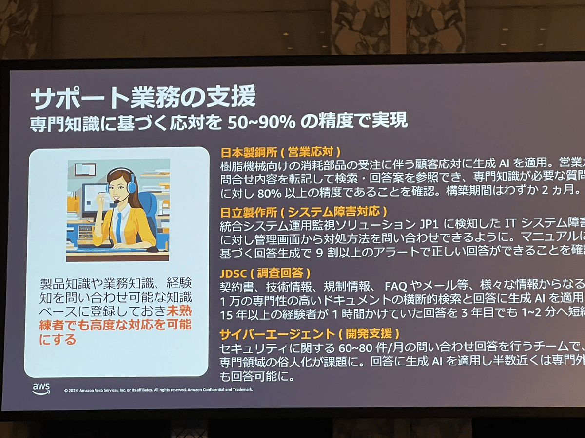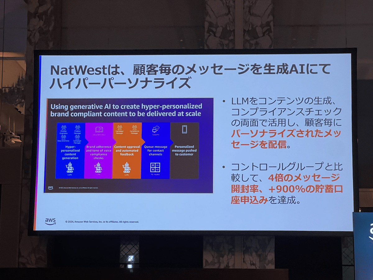 Loading tweet component... Loading tweet component... 飯田氏の講演では、まずユースケースを2つに分けました。 さらに様々な産業で共通する「一般的なユースケース」において さらに「業界特化の課題にフォーカスしたユースケース」において そして「ハイインパクトなユースケースの類型」 1社あたり3行程度の事例ですが、具体的な数字を入れつつすごい勢いでインパクトのある事例が紹介されていきます。 第一興商:入社1ヶ月の新人が3週間で9割は採用基準を満たす会話記録 AWS未経験で入社1ヶ月の新人が3週間でAmazon TranscribeとAmazon Bedrockを利用して検証。約9割は基準を満たす良好な結果。 パルシステム:マーケティングのための商材作成 北海道文化放送:FAXで届くリリース情報からニュース原稿の作成フローにAI活用 日本製鋼所: 営業応対に活用。開発期間2ヶ月 セゾンテクノロジー: HULFT製品のテクニカルサポートエンジニアが回答作成時間を最低30%短縮 パーソナライゼーションではNatWestの事例 営業活動の支援ではエフピコさんの事例で日報作成を紹介。 審査業務の効率化では野村ホールディングスの事例と、FleGrowthでの監査対応トレーニング事例が紹介されました。