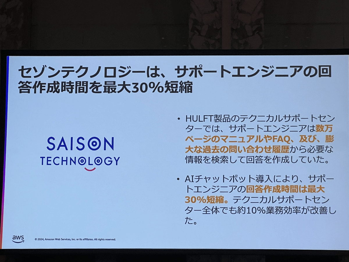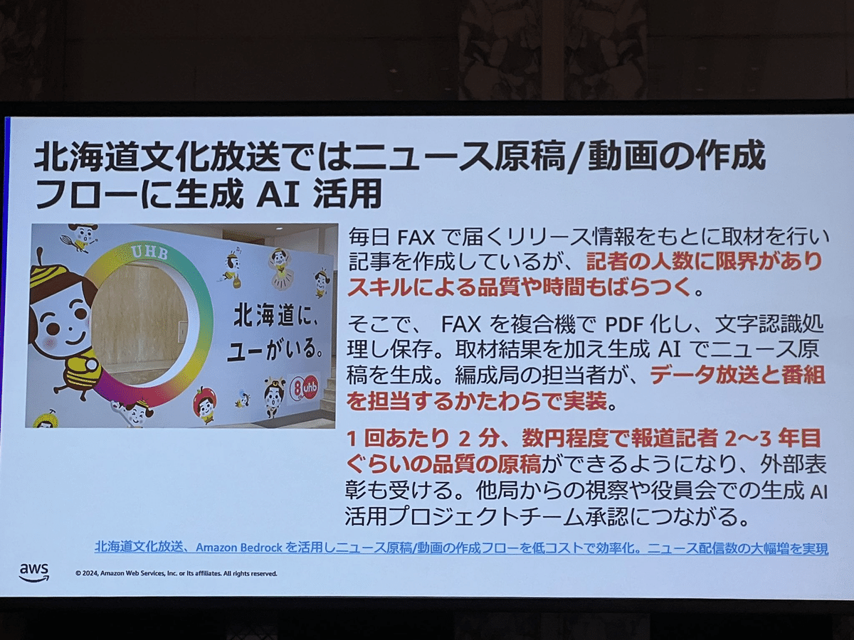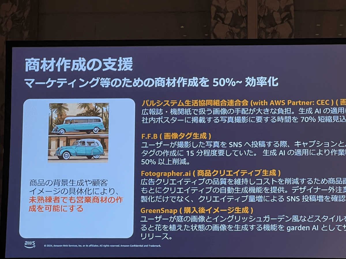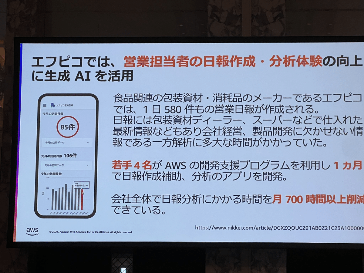 Loading tweet component... Loading tweet component... 飯田氏の講演では、まずユースケースを2つに分けました。 さらに様々な産業で共通する「一般的なユースケース」において さらに「業界特化の課題にフォーカスしたユースケース」において そして「ハイインパクトなユースケースの類型」 1社あたり3行程度の事例ですが、具体的な数字を入れつつすごい勢いでインパクトのある事例が紹介されていきます。 第一興商:入社1ヶ月の新人が3週間で9割は採用基準を満たす会話記録 AWS未経験で入社1ヶ月の新人が3週間でAmazon TranscribeとAmazon Bedrockを利用して検証。約9割は基準を満たす良好な結果。 パルシステム:マーケティングのための商材作成 北海道文化放送:FAXで届くリリース情報からニュース原稿の作成フローにAI活用 日本製鋼所: 営業応対に活用。開発期間2ヶ月 セゾンテクノロジー: HULFT製品のテクニカルサポートエンジニアが回答作成時間を最低30%短縮 パーソナライゼーションではNatWestの事例 営業活動の支援ではエフピコさんの事例で日報作成を紹介。 審査業務の効率化では野村ホールディングスの事例と、FleGrowthでの監査対応トレーニング事例が紹介されました。