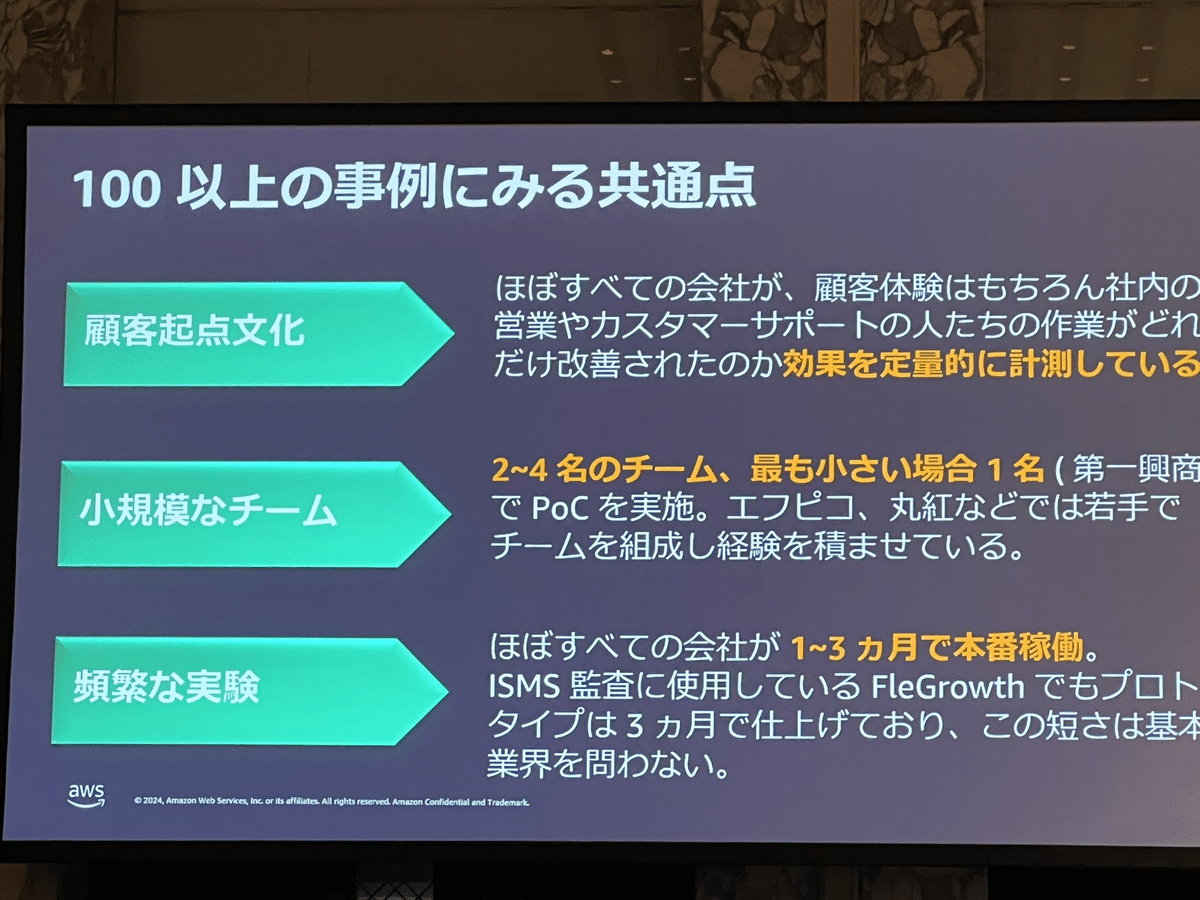 ISMS(情報セキュリティマネジメントシステム)認証のために参照する社内規定、マニュアルは100以上。 これまで6分野に分類して一気にインパクトのあるユースケースを紹介いただきましたが、実はこれらの事例には「共通点」があるそうなのです。 ・顧客起点文化: 顧客体験はもちろん社内の営業やカスタマーサポートの人たちの作業評価サイクルがあること。 これらはリクルートの新卒エンジニアチームによる事例もエビデンスと言えると感じました。 https://ja.aicu.ai/awsaiday20240909/ 成功事例には、顧客起点の文化、小規模なチーム、頻繁な実験という共通点があることがエビデンスとともに示されました。