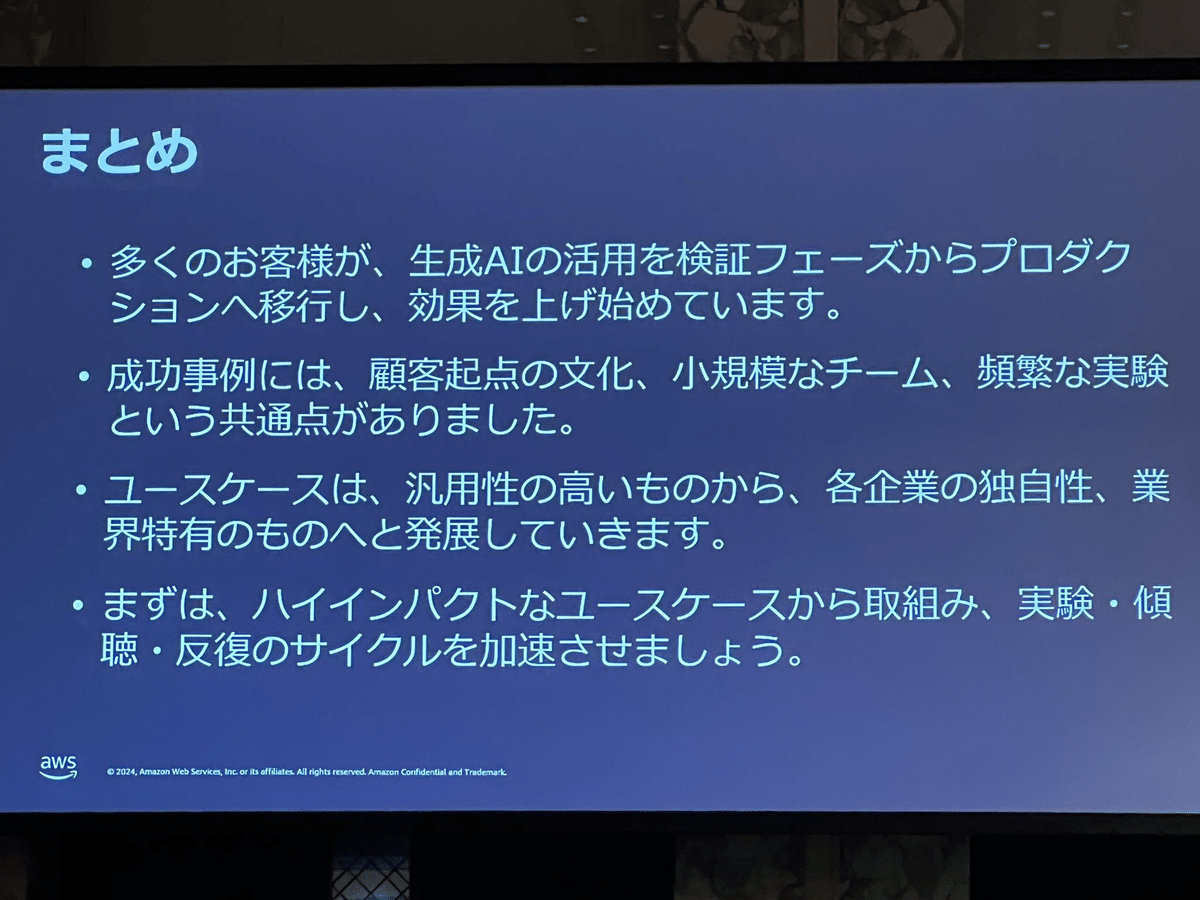 飯田氏の講演は「まずはハイインパクトなユースケースから取組み、実験・傾聴・反復のサイクルを加速させましょう」というメッセージでまとめられました。 100以上の事例を分析した結果、成功企業には以下の3つの共通点があることが明らかになりました。 顧客起点文化: 顧客体験はもちろんのこと、社内の営業やカスタマーサポートにおける評価サイクルが確立されている。 小規模なチーム: 2〜4名、もしくは1名体制でプロジェクトを推進。 頻繁な実験: 1〜3ヶ月という短期間で本番稼働までこぎつけ、PDCAサイクルを高速で回している。 これらのポイントは、リクルートの新卒エンジニアチームによる事例からも裏付けられています。 飯田氏は最後に、「まずはハイインパクトなユースケースから取り組み、実験・傾聴・反復のサイクルを加速させましょう」と締めくくりました 圧倒的な事例数と説得力のあるメッセージが印象的な講演でした。 近い講演が資料が8月に公開されていますが、飯田氏の講演ではさらに事例の追加と整理が進んでいるという印象でした。 世間一般で言われているような「企業でのAI活用が進まない」というステレオタイプとは裏腹に、かなりのスピード感で一般化しており、また「インパクトのある成果の影にAWSあり」という印象を持つことができました。 圧倒的な事例数によるすごくいい講演だと思いました。 Loading tweet component... Loading tweet component... 【レポートはまだまだ続きます!】 次回は、KDDIアジャイル開発センター株式会社のテックエバンジェリスト、御田 稔(みのるん)氏による講演「突撃!隣のAmazon Bedrockユーザー