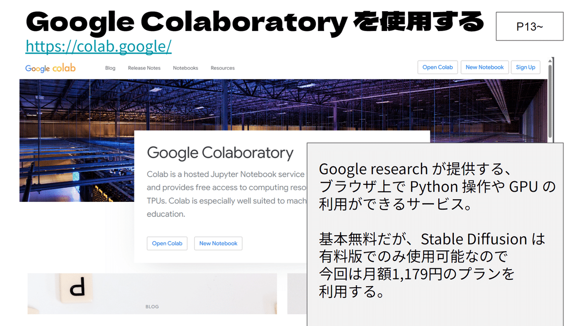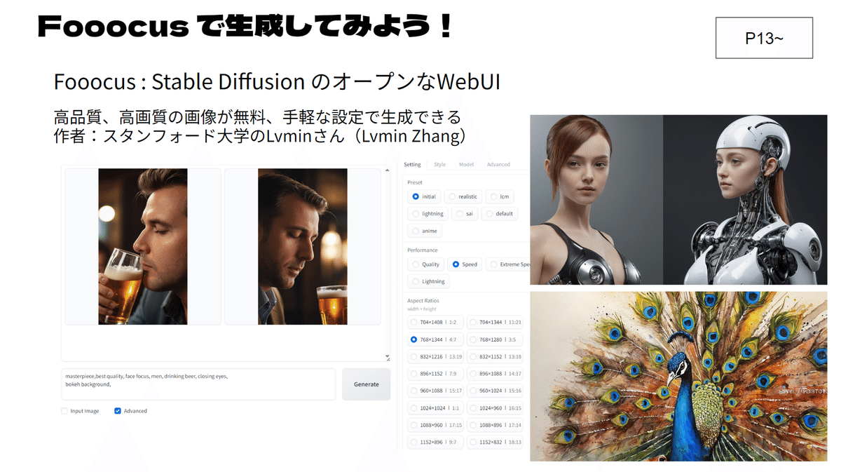 演習環境は、全員がリモート環境で参加し、175名という多人数であるため、初日はスキルと環境を確認する意味があり、Google ColabとFooocusを使用しています。