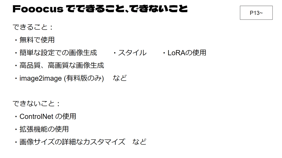 その他、モデル、LoRAに関する知識、ライセンスなど、高度な話題が続きますが、ここは割愛です。